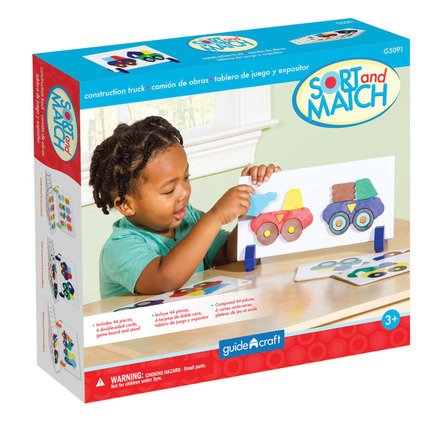 Construction Truck Sort and Match is the perfect way to teach color and shape matching, sorting, sequencing and pattern recognition in a fun, game-like setting. Heavy duty pieces attach to the matching board with pegs and embedded magnets. Construction Truck Sort and Match includes six double-sided pattern cards, 48 construction truck pieces, and a self-propping board and stand with pegs and a metal backing to help guide the parts into place. Ages 3+.6 double-sided pattern cards, magnetic pieces, embedded magnets, box for storage
