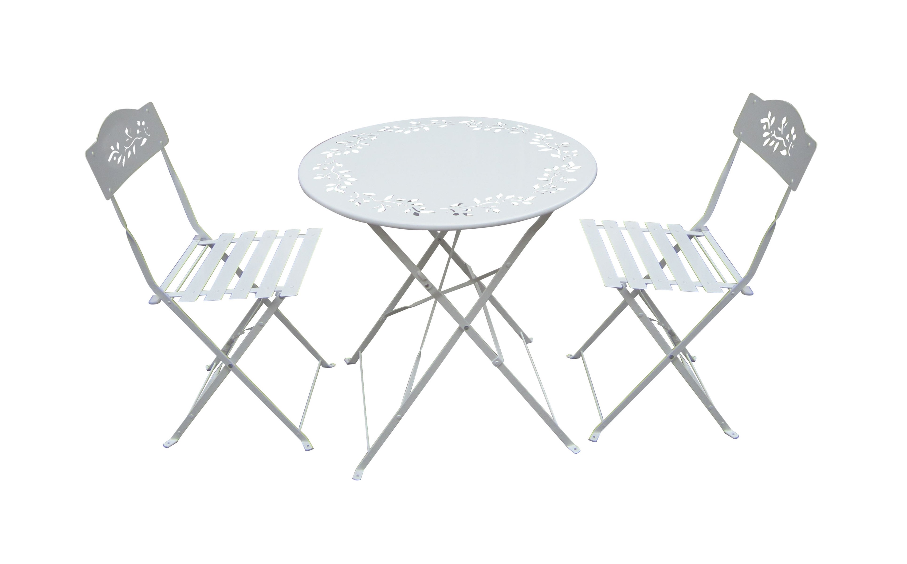 This foldable bistro table and chair set is made from 100% steel and is made to withstand the outdoors. It has a modern trendy look typical of most bistros. A perfect addition to your patio.
