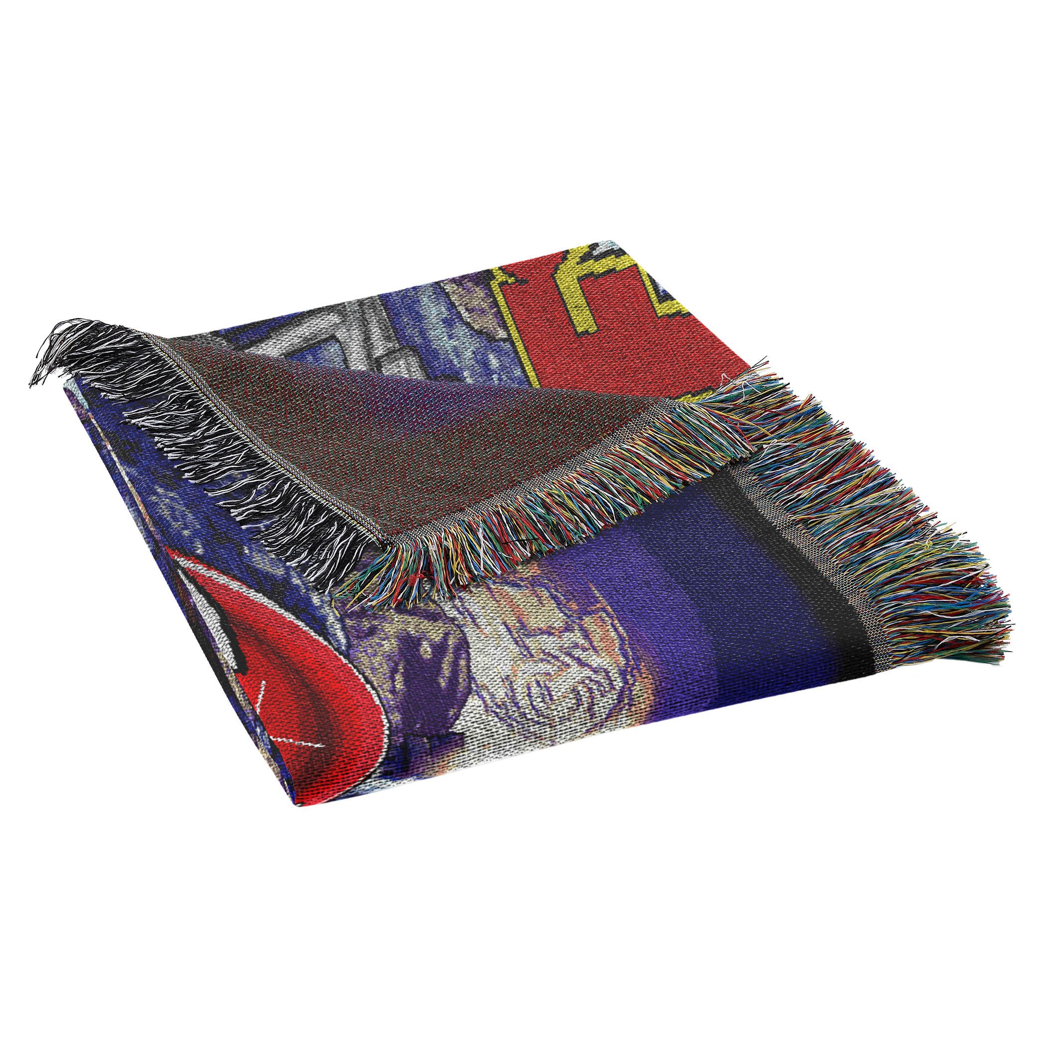 Detailed, woven tapestry; decorative fringes around all edges; made in America