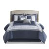 510 Design presents the Powell 8 Piece Embroidered Comforter Set to elevate your bedroom decor. This hotel style navy comforter features an embroidered and pieced border for a sophisticated and elegant design that easily coordinates with your space. The matching pillow shams also flaunt beautiful embroidery details, while the grey Euro shams are accented with graceful navy flanges to complete the transitional look. A solid navy bedskirt and 2 decorative pillows with embroidered details add the finishing touches to this hotel style bedding set. Hypoallergenic polyester filling in the comforter and pillows contains no allergens and is treated to be dustproof. Machine washable for easy care, this embroidered comforter set may come in rolled or compressed packing and will need to be fluffed up. Use a steam iron to help remove wrinkles easier.
