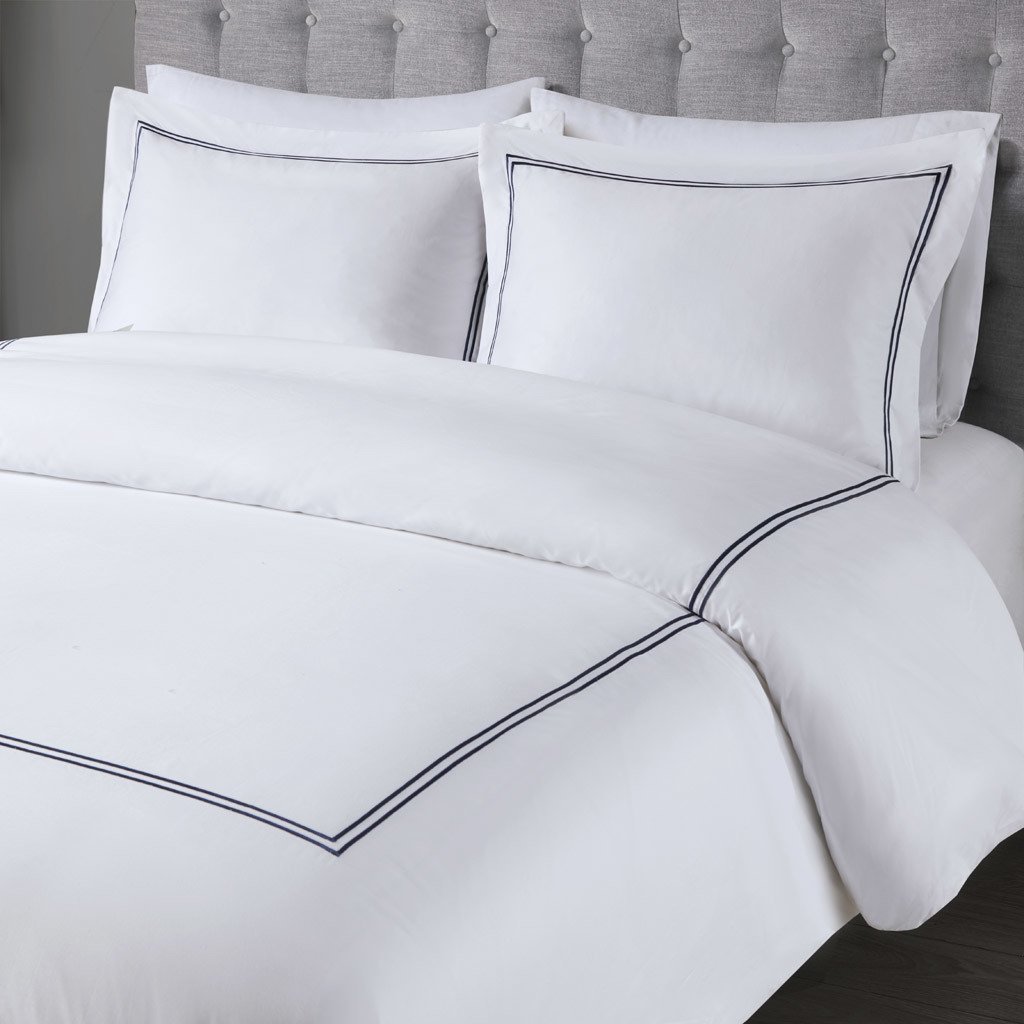 Make every night feel like a luxurious hotel escape with this 500 Thread Count comforter set. Made of soft cotton, this refined 5 piece set features a double-row striped embroidered border for an elegant finish. The duvet cover is removable and has corner ties with a zipper closure for easy care. This set is also OEKO-TEX certified, meaning it does not contain any harmful substances or chemicals to ensure quality comfort and wellness.