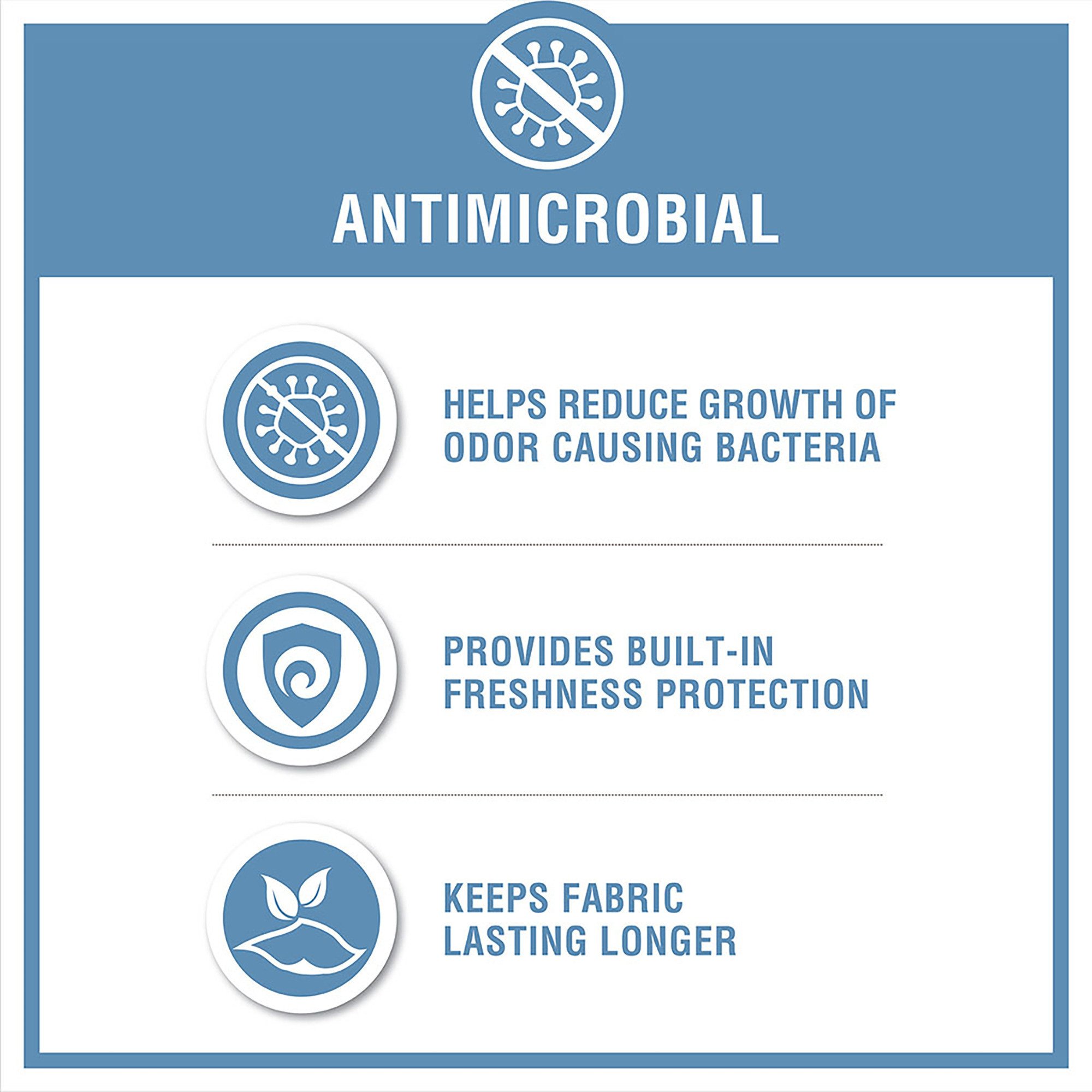 Antimicrobial treatment helps reduce the growth of odor causing bacteria and keeps fabric lasting longer