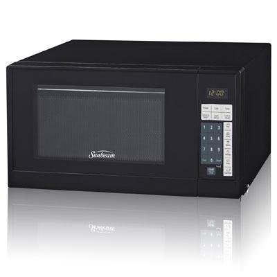 Black finish Sunbeam branded 0.9 CuFt. Digital Microwave Oven with 10 adjustable power levels, 6 One-touch cooking options and LED display with digital timer and clock, 900 Watts.